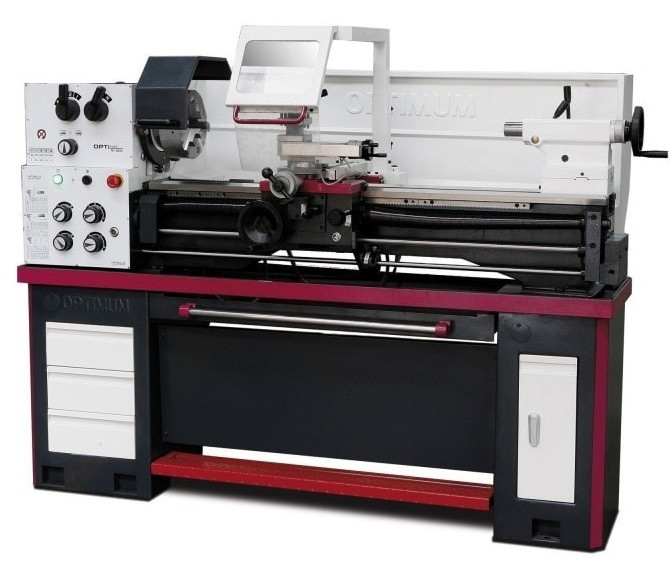 Le tour est équipé d'un socle de machine avec tiroirs et armoire de rangement à droite et à gauche, offrant un espace de stockage pratique pour les outils et les accessoires.