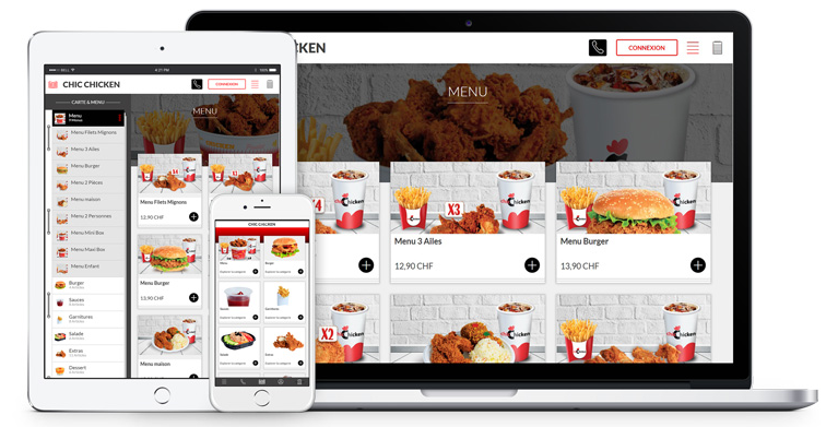 -Vente sur internet : site internet relié à la caisse avec récupération en mode Click & Collect ou en mode livraison traditionnelle. -Vente à table : menu interactif à table sur tablette ou smartphone. La commande part directement en cuisine. - Vente à emporter : la Borne de commande tactile avec menu illustré pour permettre aux clients de commander et de payer sans faire la queue en caisse, ni s’asseoir à table.