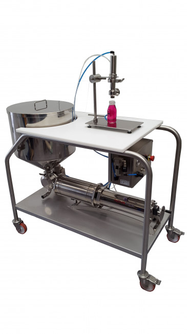 Doseur volumétrique pneumatique sur chariot mobile adapté aux produits alimentaires liquides, visqueux et pâteux avec et sans morceaux.