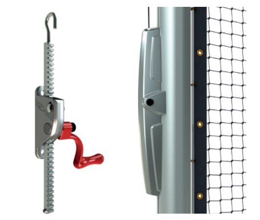 Grâce à sa manivelle ergonomique plastifiée rouge, vous réglez la tension du filet en toute simplicité, sans risque de pincement grâce à son blocage sécurisé à boutons de relevage.