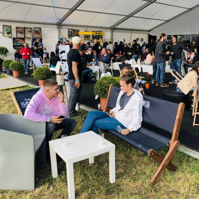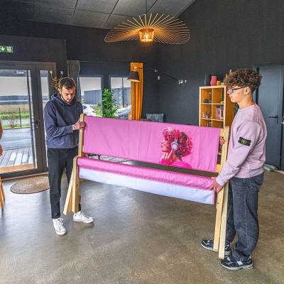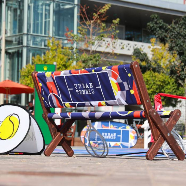 Banc publicitaire en bois pliable - avec impression textile personnalisée - L.163 cm x H.86 cm x P.50 cm