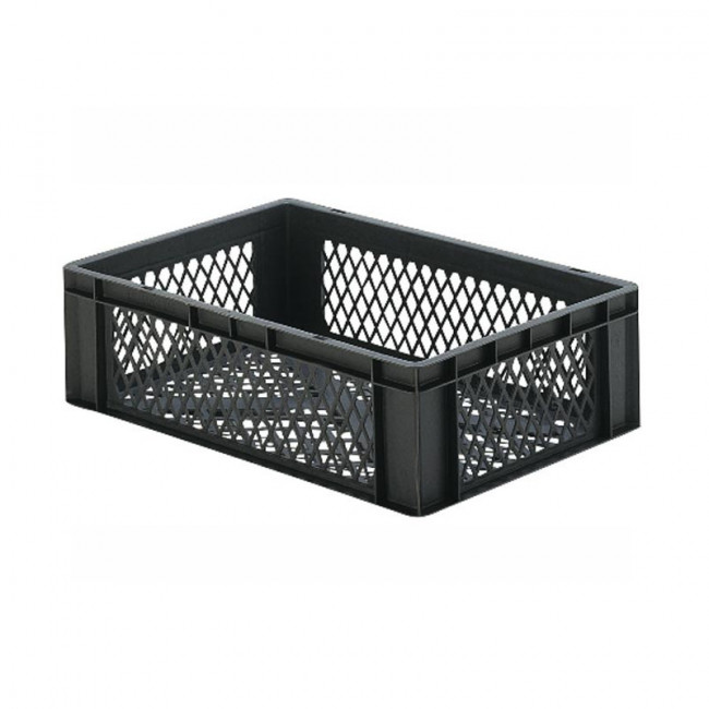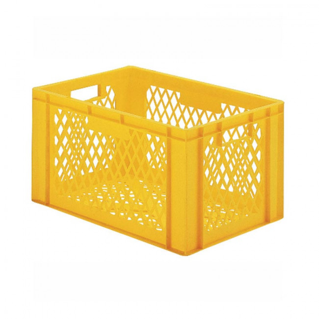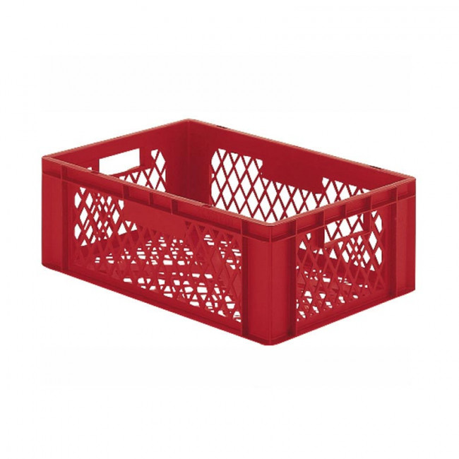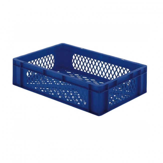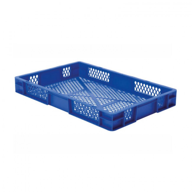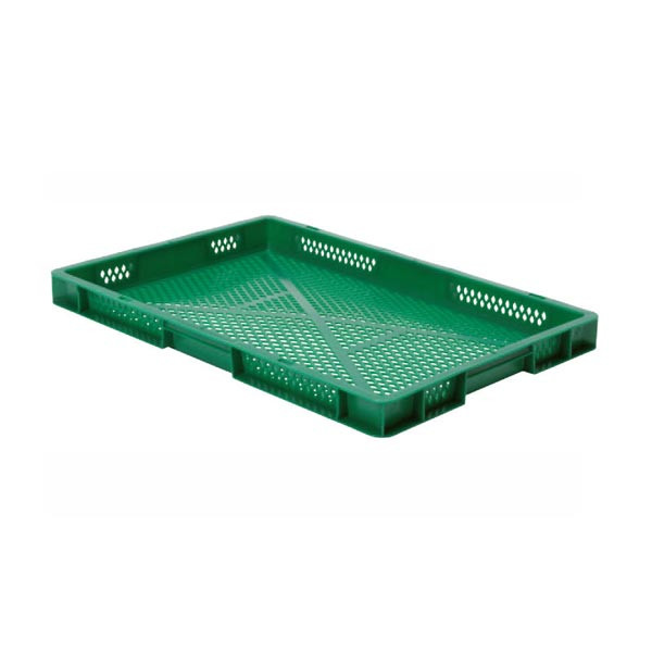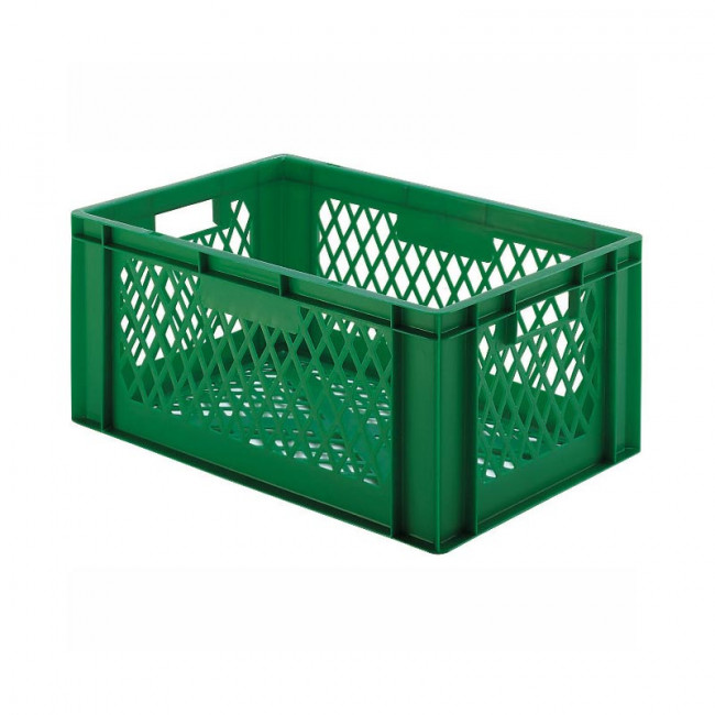 Stockage et manutention de denrées alimentaires fraîches, utilisation en industrie agroalimentaire et entrepôts frigorifiques, transport et ventilation de produits sur lignes logistiques automatisées, équipement pour entreprises de logistique et plateformes de distribution, bacs alimentaires pour exploitations agricoles et coopératives, contenants plastiques normés pour usines et ateliers industriels.