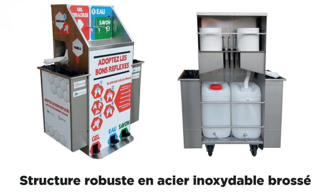 Pour plus de sécurité et pour répondre aux attentes et rassurer vos clients ou salariés, l’ensemble des opérations s’effectuent uniquement avec les pieds grâce aux trois pompes à pied : savon, eau et gel hydro-alcoolique.