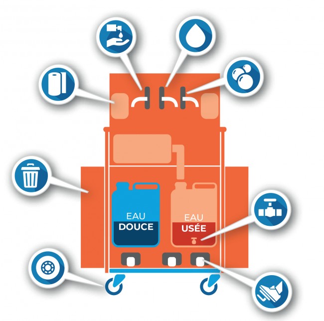 Système autonome de lavage des mains et de désinfection, le lave-mains dispose d’un bidon d’eau douce et d’un bidon d’eau usée d’une contenance de 25 litres (jusqu’à 50 lavages autonomes), un emplacement de 5 à 10 litres pour le savon liquide est également prévu.