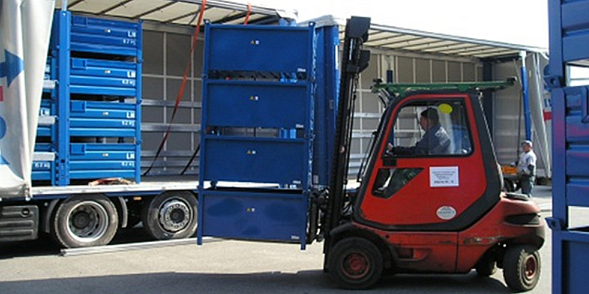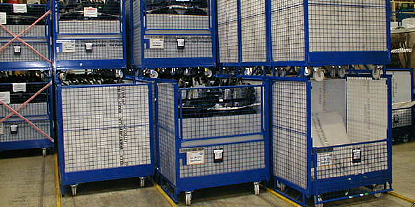 stockage de plaques de verre conditionnées en boites de polypropylène. Poids important des boites. Ne pas superposer les boites.