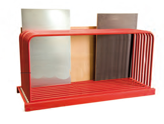 Équipé de 10 ridelles en tube Ø 35 mm hauteur 900 mm, de 9 compartiments de 40 mm et d’un plateau en médium recouvert d'une tôle électro zinguée.