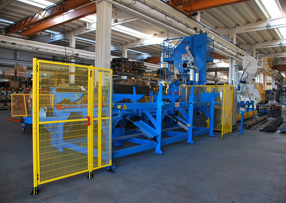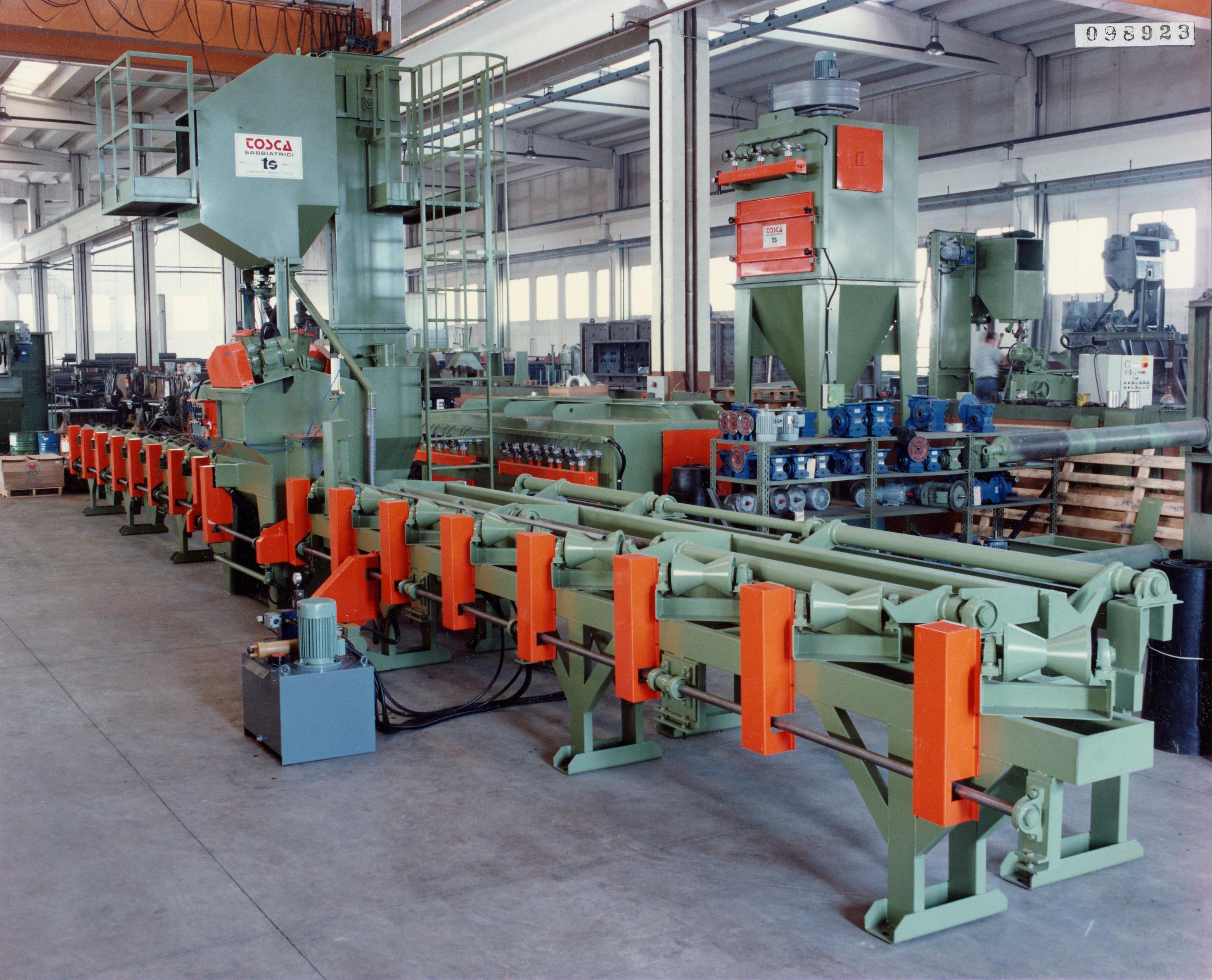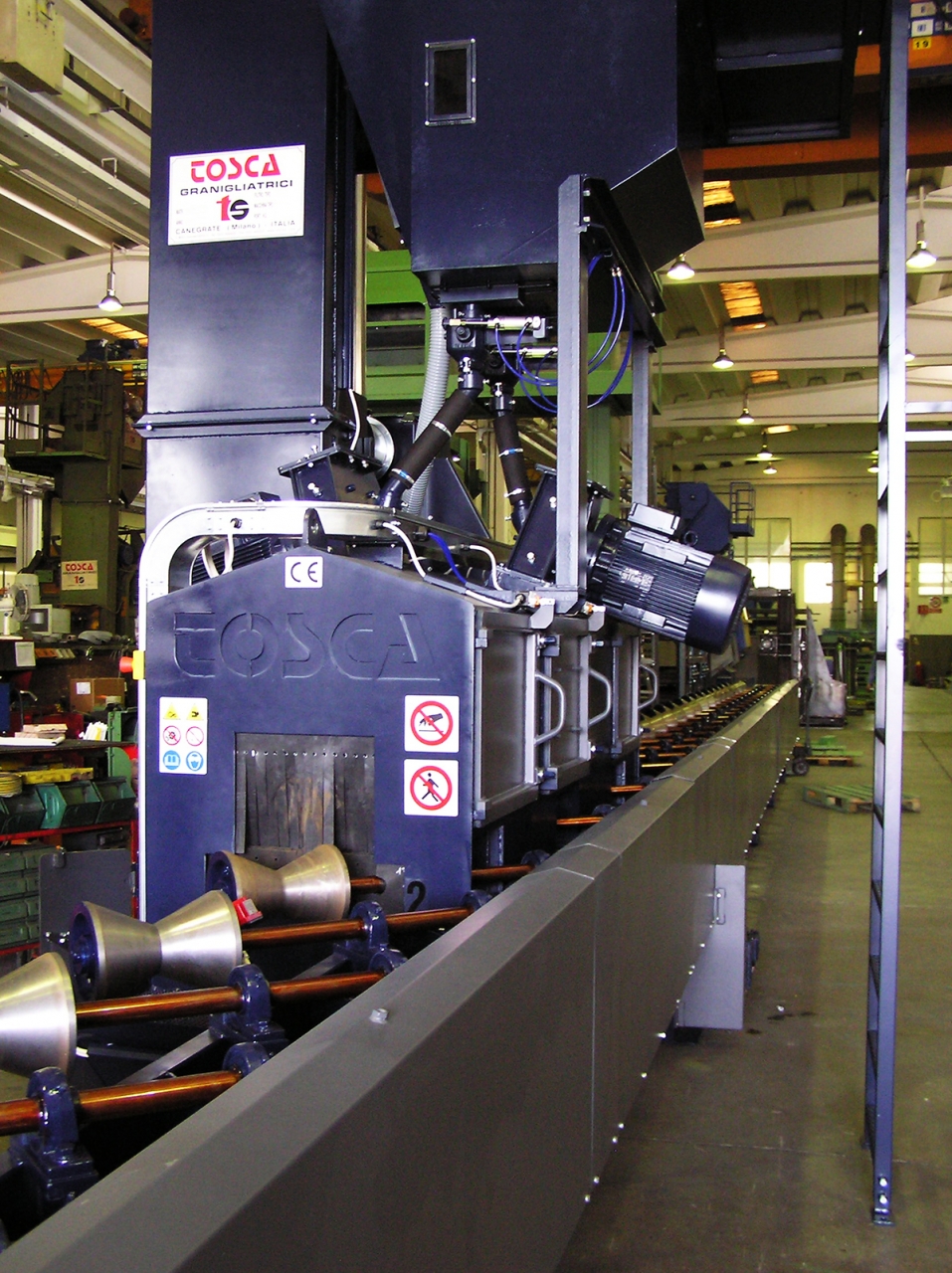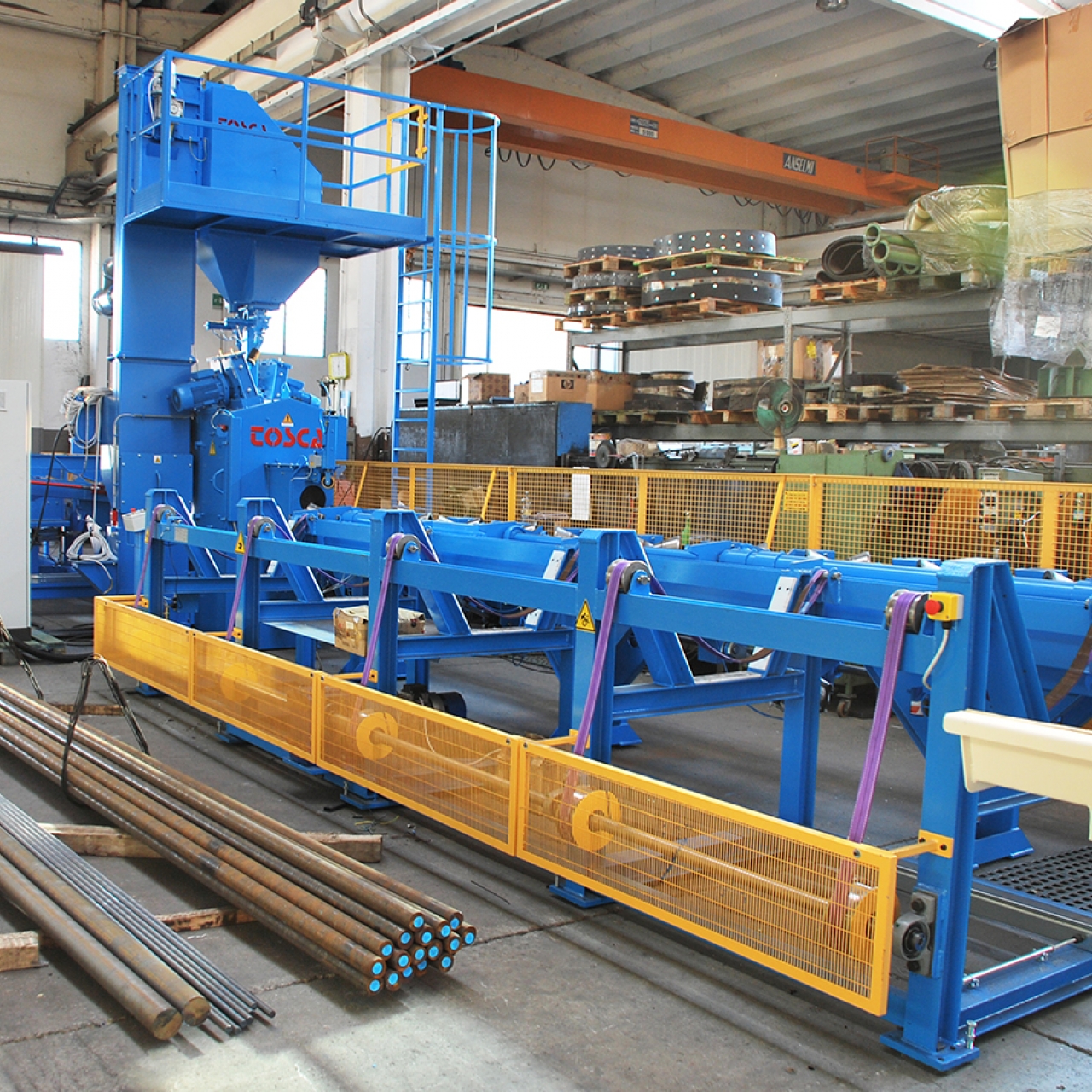Les rouleaux ont une inclinaison telle qu'ils permettent d'assurer la rotation et l'avance du tube ou de la barre pendant le grenaillage.