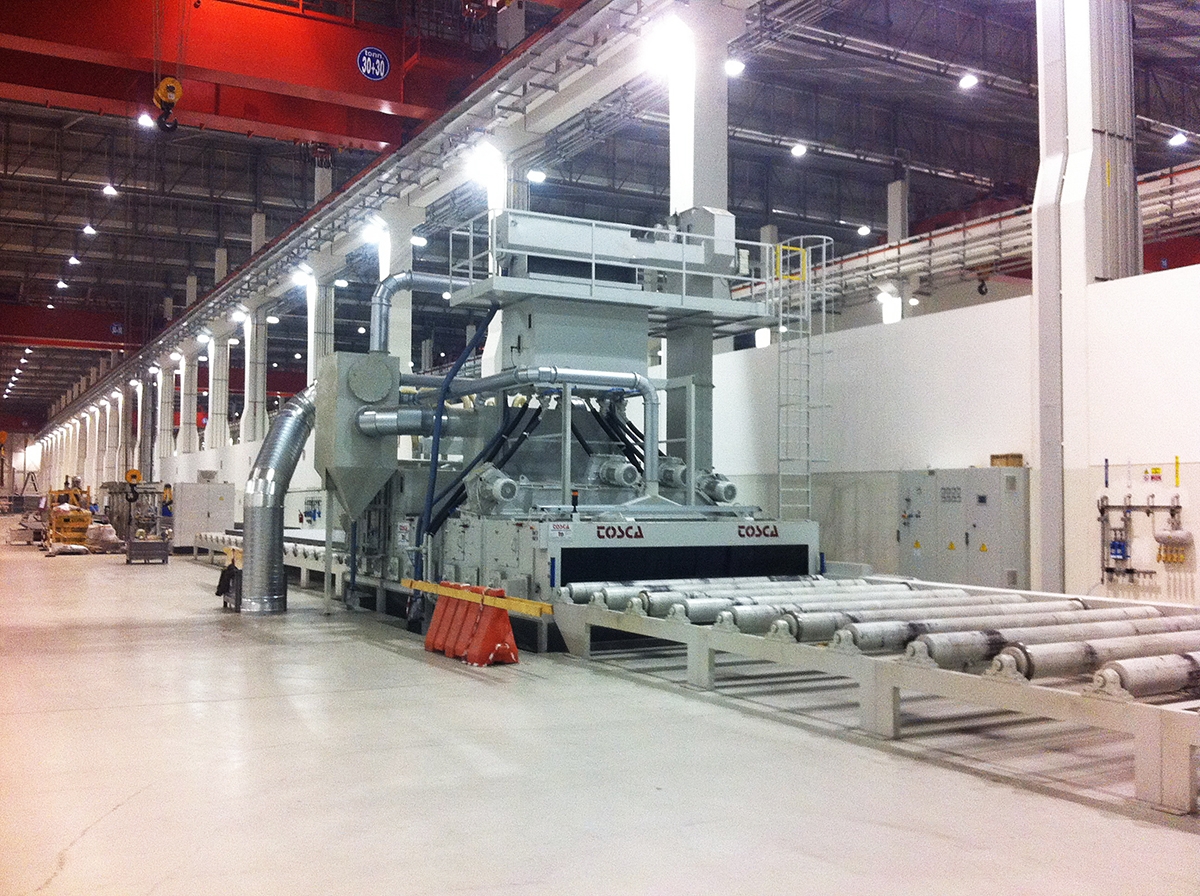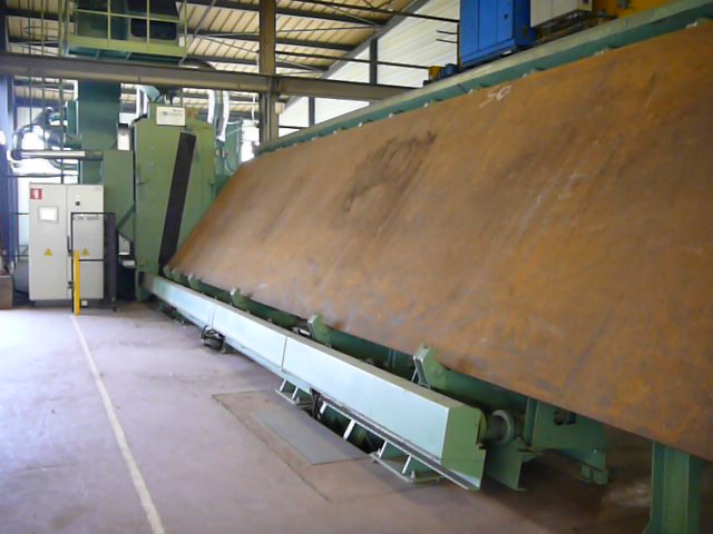 La disposition et le nombre de turbines, montées aussi bien au-dessus qu'au-dessous du plan de roulement du produit à traiter, permettent le nettoyage parfait en un seul passage de toutes les surfaces à décaper.