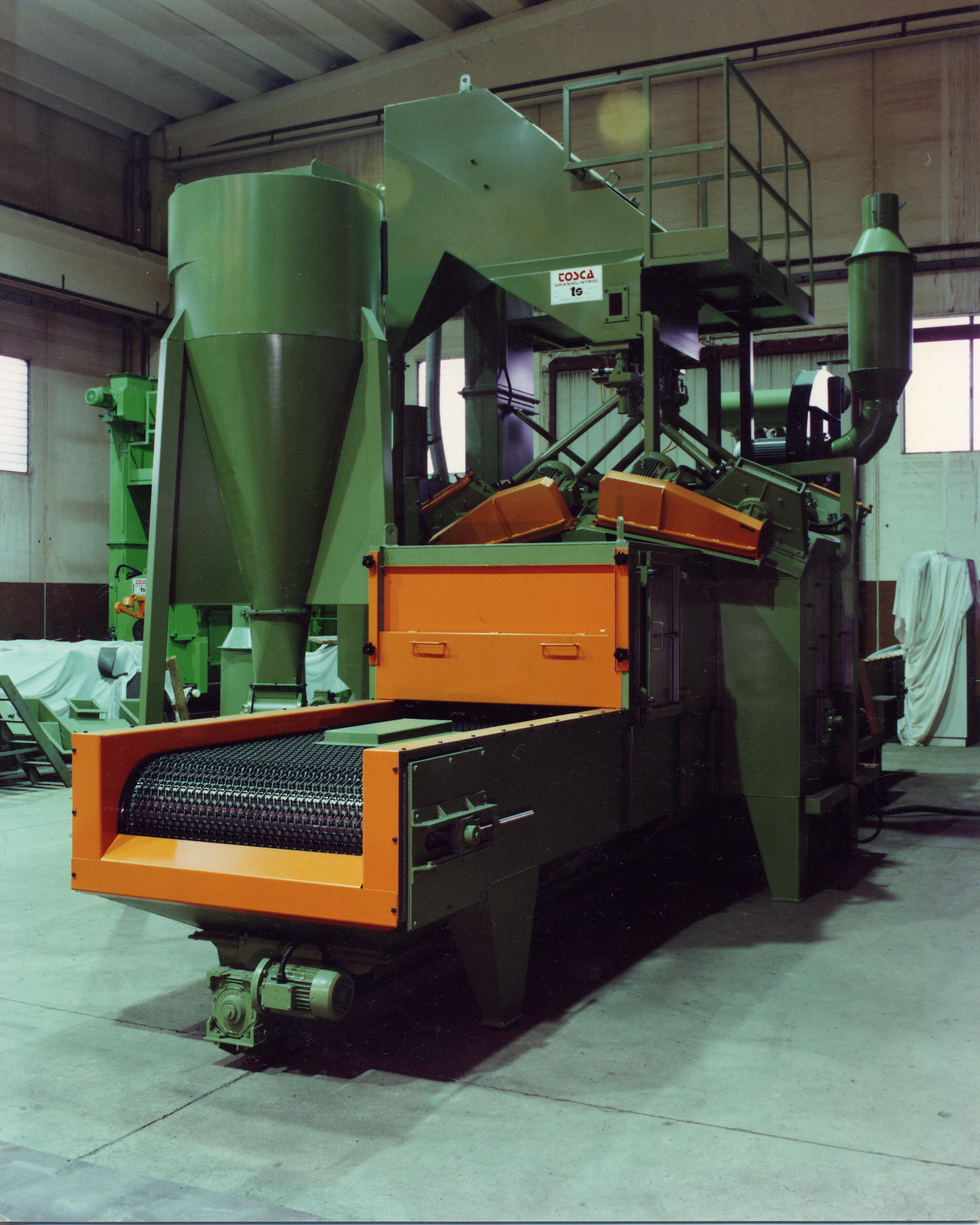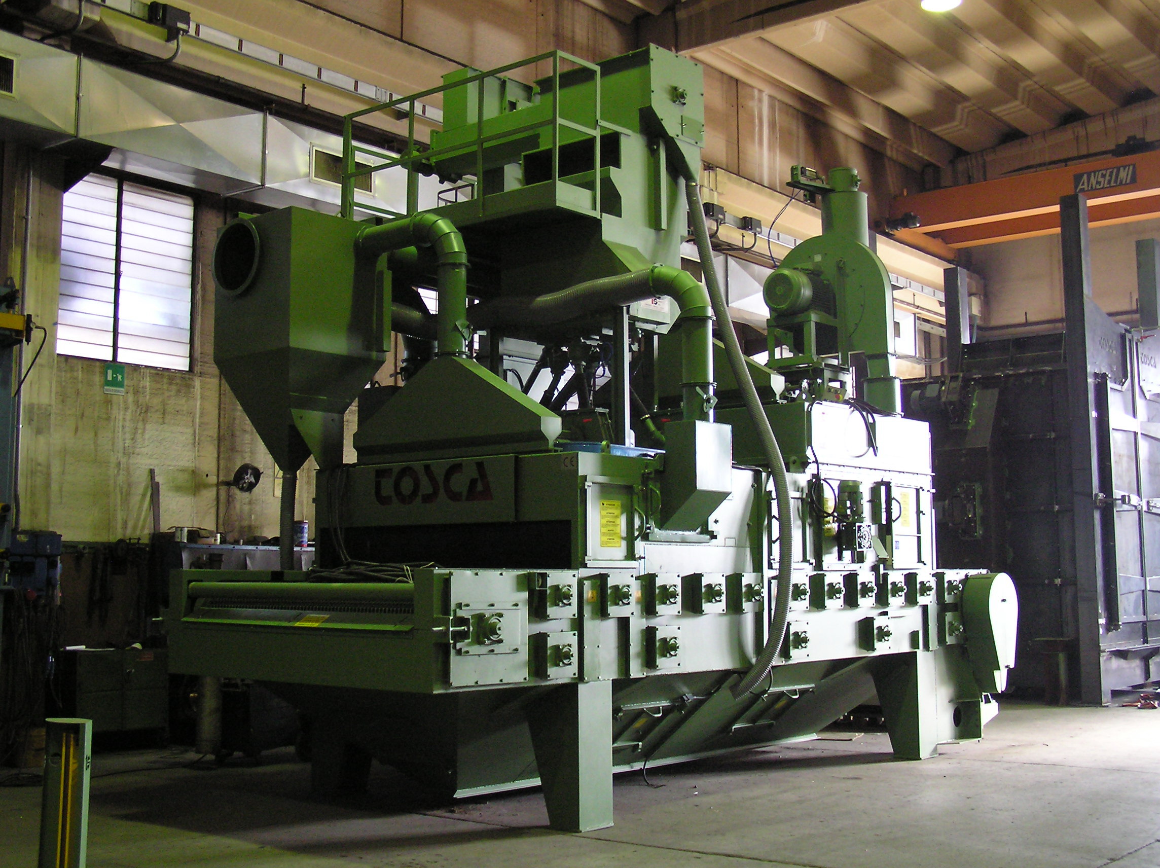 - La manutention s'effectue au moyen d'un transporteur à tapis horizontal en grillage, tandis que l'effet de grenaillage s'obtient grâce à la projection centrifuge (sans air comprimé) de grenaille sphérique en acier.