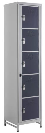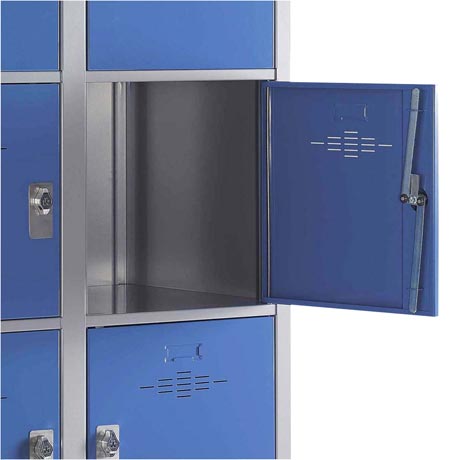 - La façade (en 2 parties sur les casiers 2 colonnes) s’ouvre totalement permettant ainsi une visite collective des cases - Serrure centralisée à clefs - Façade visitable en acier ép. 2 mm renforcée par des traverses horizontales en acier ép. 2 mm.