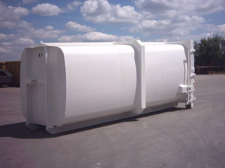 Cette benne à compaction de 30 m³ est conçue pour stocker et transporter des déchets compressés.