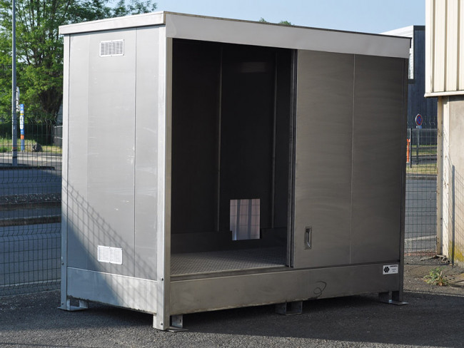 Conteneur de stockage pour fûts ou 2 IBC. Module en inox avec rétention, il est doté de 2 portes coulissantes. Il mesure 3 mètres de long et possède une grande hauteur qui facilitent la manipulation des fûts, cuves, cubitainers ou IBC.