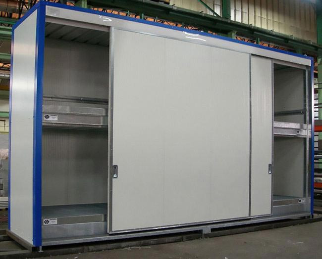 Ce conteneur de stockage pour produits dangereux est une armoire avec rétention sur 2 niveaux, 6 m long, avec isolation et bacs de rétention.