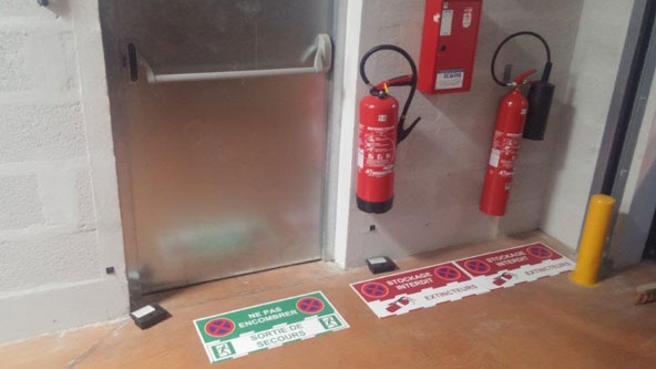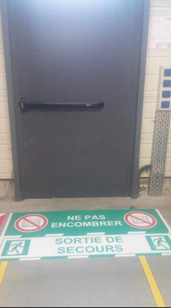 - un marquage au sol pour zone " ne pas stocker issue de secours" devant une porte