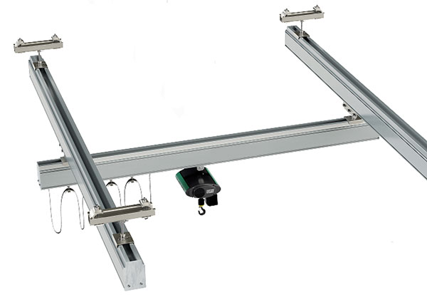 je souhaite une documentation technique et commerciale d"un petit pont roulant sur rail (pour déplacement en croix (nord sud est ouest) ) avec proposition de prix Charge portée maxi 200 kg déplacement maxi sur les 4 cotés 1,5 mètres hauteur de levage maxi 2 mètres