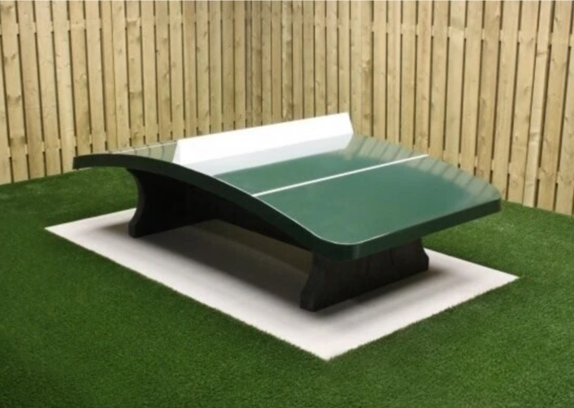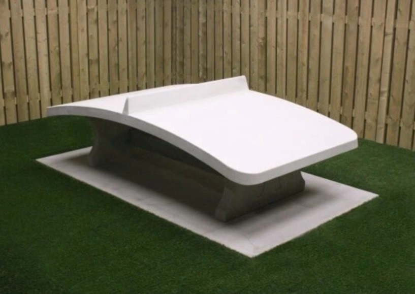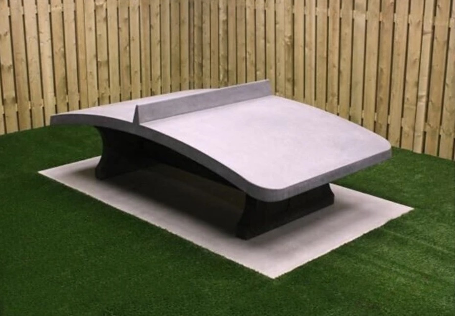 Dotée d'un plateau légèrement courbé et aux dimensions standards d’une table de ping-pong (274 x 152 cm), cette table est entièrement en béton et fabriquée en une seule pièce.