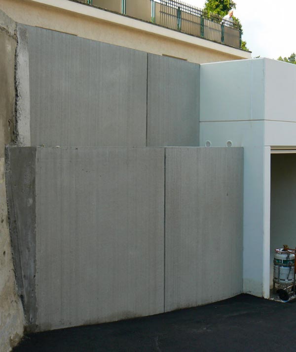 Le mur de déchetterie en béton fait 3 mètres de hauteur et de 2 à 2.75 mètres de longueur.