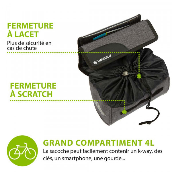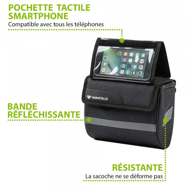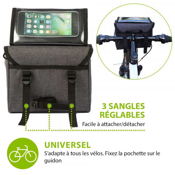 - Installation rapide : fixez la pochette sur le guidon à l’aide des 3 sangles réglable