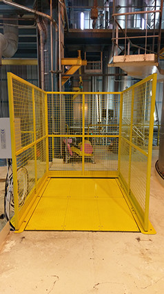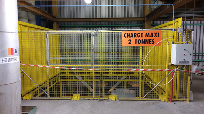 La trappe relevée sert de protection antichute dans la trémie et permet le libre passage des charges manutentionnées et crochetées au palan dans un passage libre. Pendant l’opération de transfert de charges, les garde-corps autour de la trappe sont fermés et interdisent l’accès à l’ouverture.