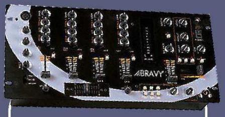 4 canaux stéréo 8 ligne, 3 phono, 2 micro avec talkover, 6 effets, echo prise micro DJ crossfader assignable prise pour lumière rackable 19” sortie master