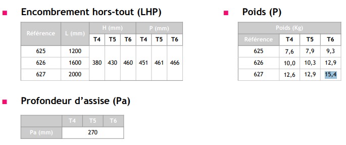 380 mm (T4), 430 mm (T5), 460 mm (T6)