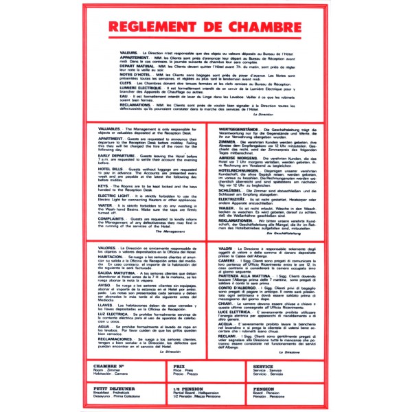 - Règlement des chambres en 5 langues