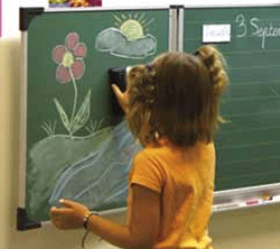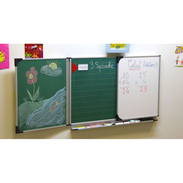 Ce tableau scolaire est composé d’1 panneau central et de 2 volets qui recouvrent la partie centrale, comme à l’école.
