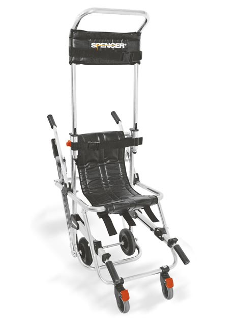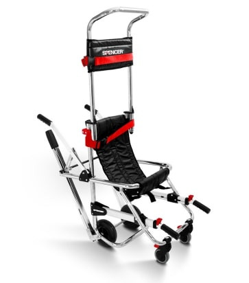 Cette chaise d'évacuation est idéale pour les transferts d'escaliers grâce à un système de courroies autofreinant intégré qui permet de glisser sur les marches.