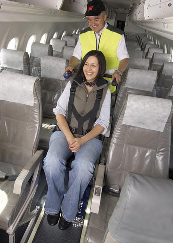 - Arrivé dans l'avion, un transfert vers une chaise de transport spécifique n'est plus nécessaire.