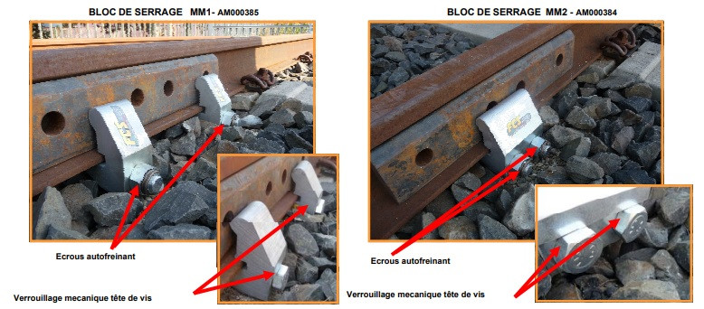 1 Boulon haute résistance pour le serrage de rail MM1 2 Boulons haute résistance pour le serrage de rail MM2 1 écrou auto-freinant pour maintenir le serrage de rail MM1 1 écrous auto-freinant pour maintenir le serrage de rail MM2