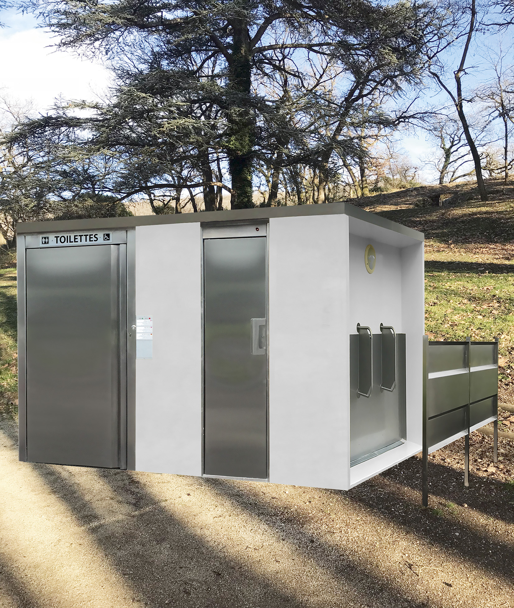 La cellule sanitaire et urinoirs extérieur PMR contient tous les équipements nécessaires afin de répondre aux recommandations en vigueur concernant l’aménagement des locaux sanitaires pour PMR et personnes âgées.