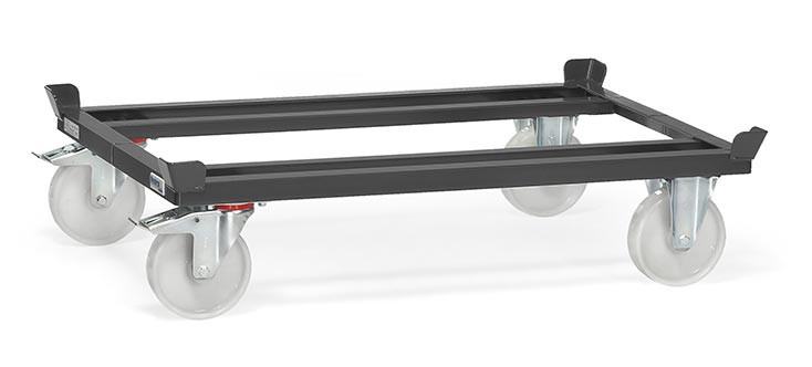Ce chariot porte-palettes avec roues en polyamide est conçu pour le transport de palettes en bois ou grillagées.