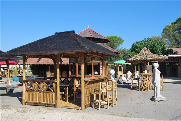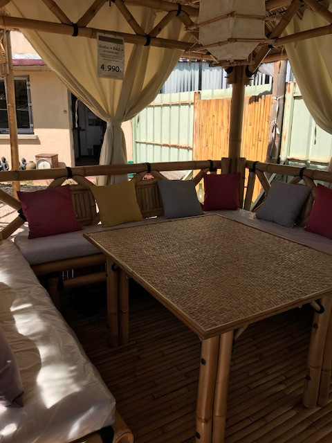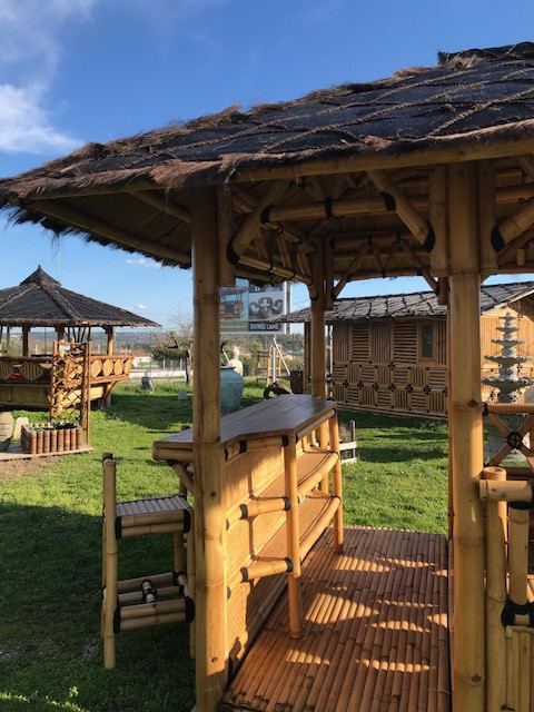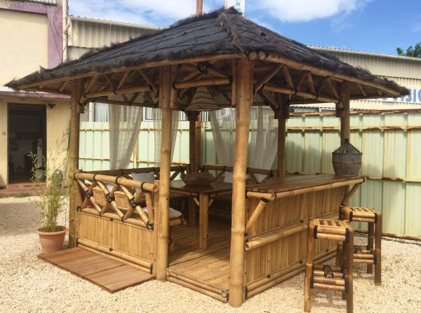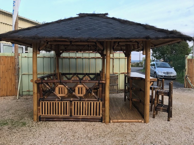 - Comprend la toiture, les piliers ainsi que les assises, le plancher, la table, le bar avec un plateau en bois ainsi que 3 tabourets assortis