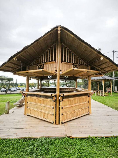 Grâce à sa toiture en chaume résistante aux intempéries et son ossature robuste en bambou naturel, notre structure bambou sur-mesure s’adapte à un usage en extérieur, quelles que soient les conditions météo.
