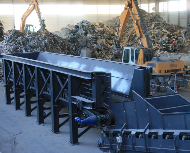 La trémie de réception et de déchargement est alimentée par des engins (chargeuses, grues, camions) et permet de stocker de la matière en tampon avant traitement.