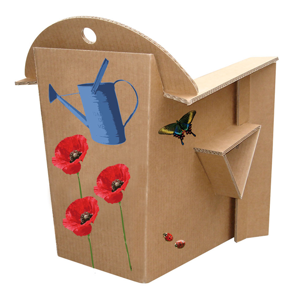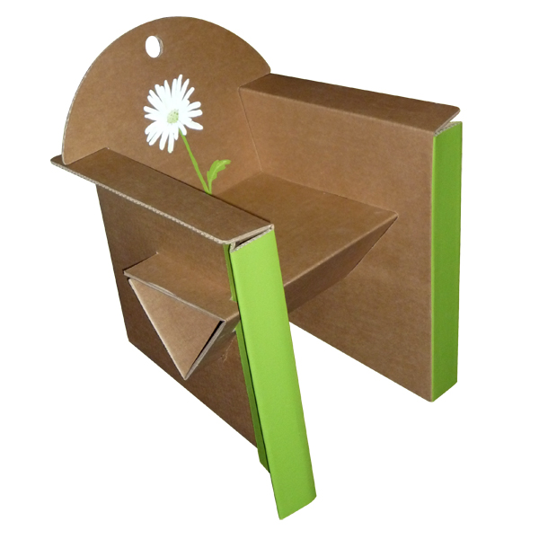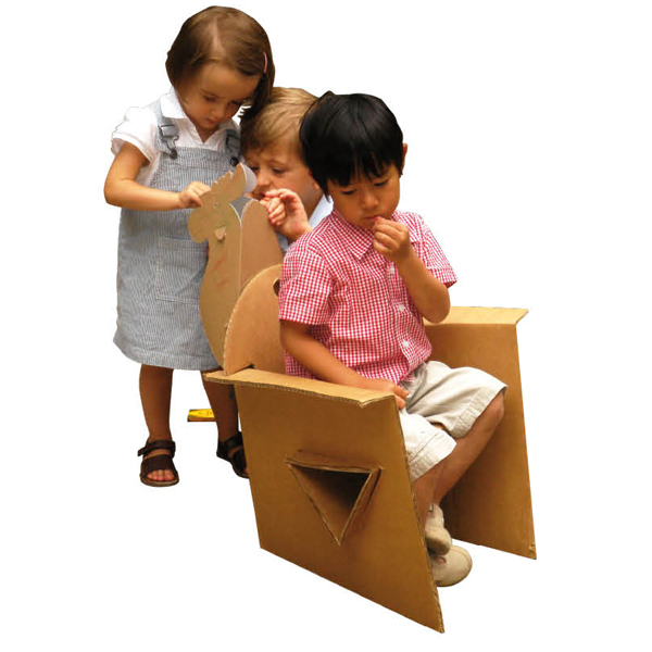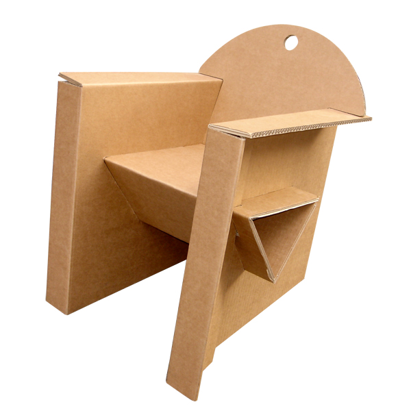 Fauteuil Carton Enfant composé de 2 plaques de carton prépliées. La seule poutre triangulaire suffit à sa résistance. Des renforts latéraux se verrouillent dans la poutre, comme pour le Fauteuil Adulte.