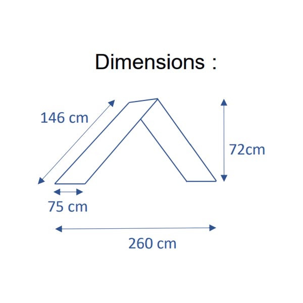 Les dimensions (longueur 260 cm, largeur 75 cm, hauteur 72 cm, profondeur 146 cm) permettent de travailler aussi bien avec de petits chiens qu’avec des chiens de gabarit plus important, sans modifier la structure de l’obstacle.