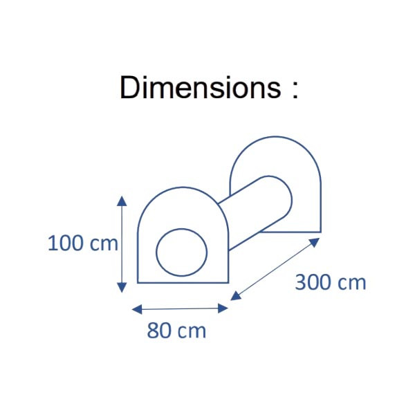 Avec ses dimensions L.300 x P.80 x H.100 cm, le tunnel offre une longueur suffisante pour travailler la confiance, la concentration et la vitesse du chien tout en restant adapté à la plupart des gabarits.