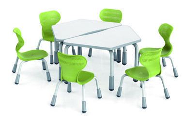 Cette table modulable en forme trapèze est réglable en hauteur. Cette solution permet de travailler de manière individuelle qui s’adapte aux tailles des plus petits.