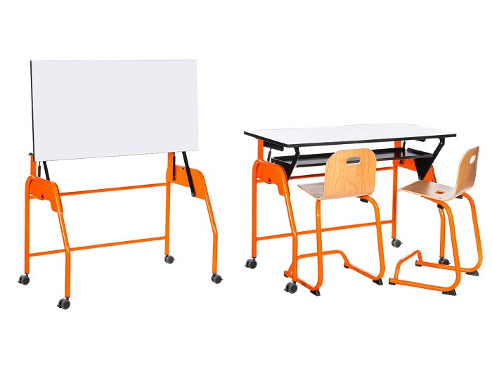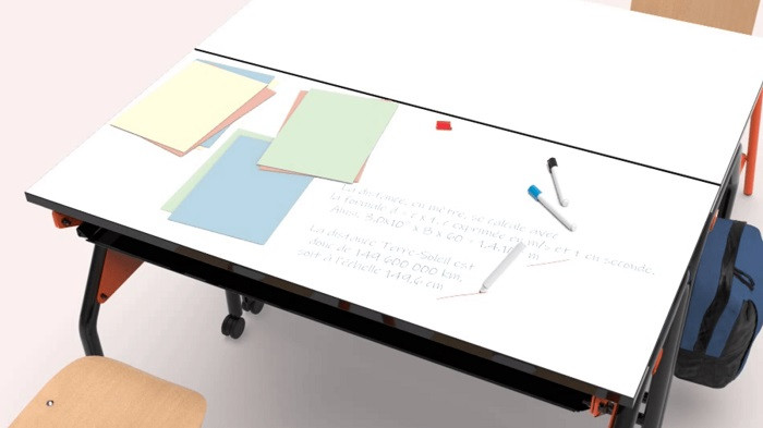 En position horizontale, elle offre un espace de travail confortable pour deux élèves, tandis qu'en position verticale, elle se transforme en tableau blanc, permettant une utilisation optimale de l'espace et des ressources pédagogiques.