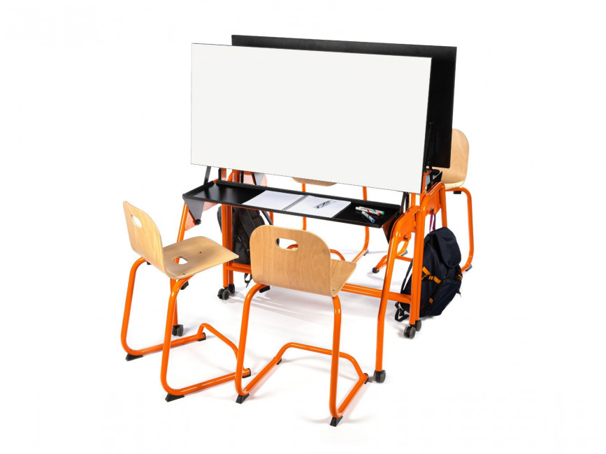 En position tableau, le plateau peut être utilisé des deux côtés grâce à son mécanisme latéral, permettant aux élèves de partager leurs acquis avec leurs camarades.