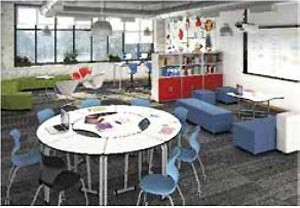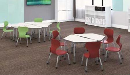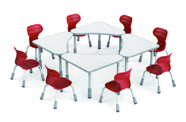 JUK 819 est une table modulable en forme triangulaire qui est réglable en hauteur. Cette solution permet de travailler de manière individuelle qui s’adapte aux tailles des plus petits.