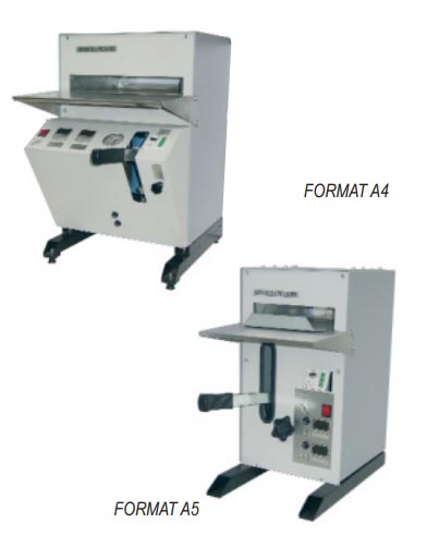 - La pression hydraulique est assurée par pompe et verin séparés pour le format A4 et pompe et vérin acouplés pour le format A5.