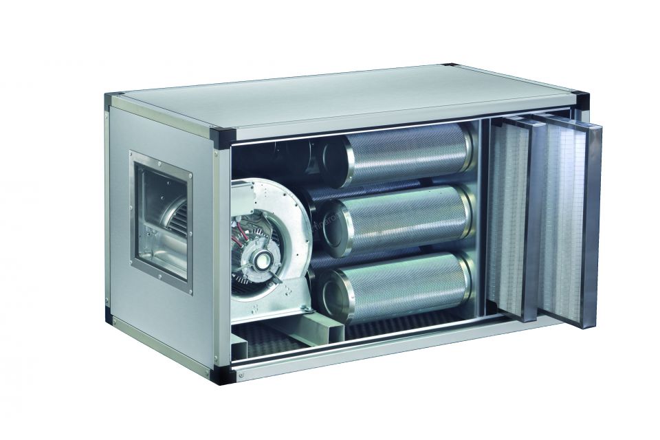 Ce caisson de ventilation est équipée d’un Préfiltre air de type EU3, 85% gravimétrique avec charbon actif végétal en granulés de type 207/C.