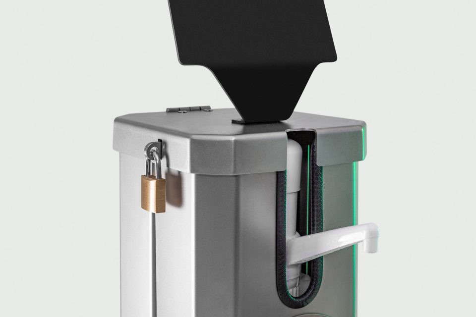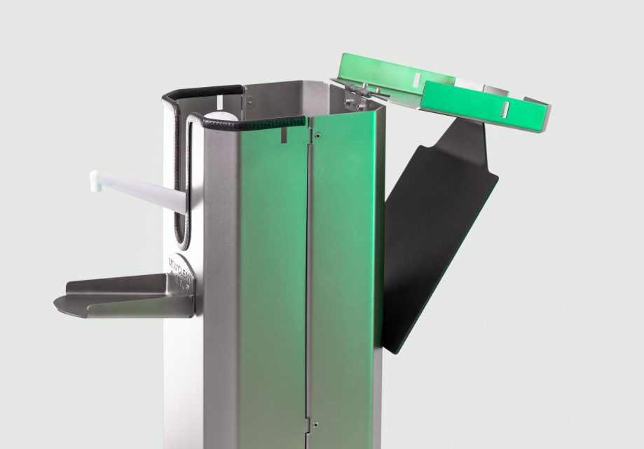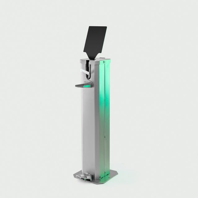 Cette borne de gel désinfectant assure la distribution du gel hydroalcoolique.