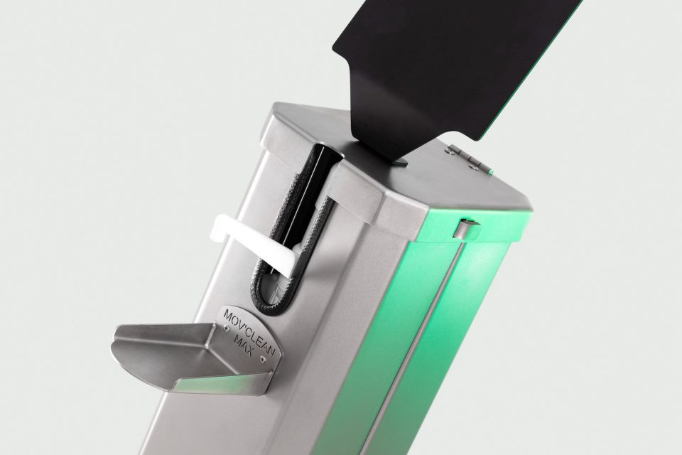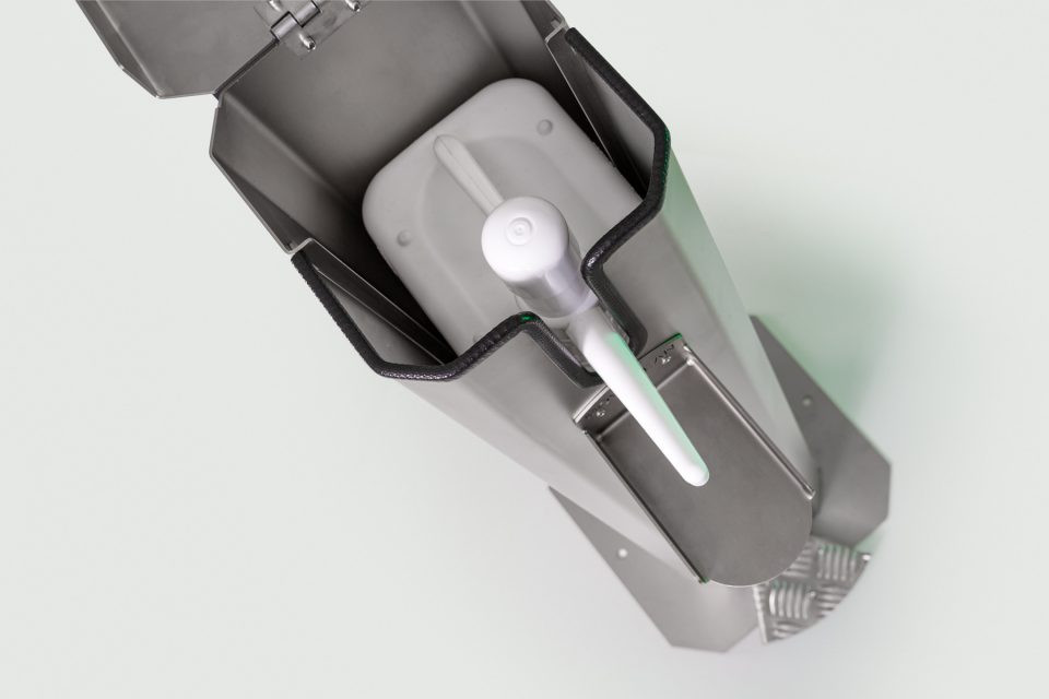 La distribution du gel hydroalcoolique se fait par simple pression du pied.
