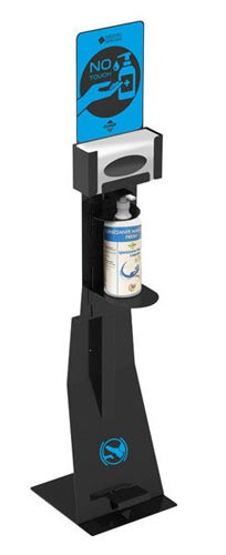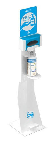 Cette borne de désinfection est équipée d’un compartiment pour un distributeur de gel ou solution hydroalcoolique.