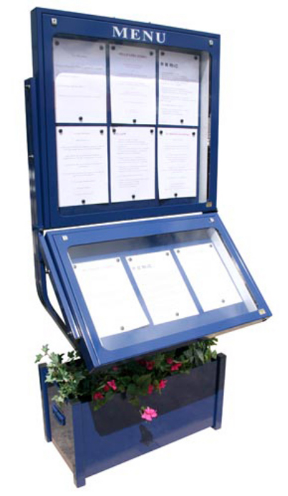 Vitrine porte-menu lumineuse montée sur pied jardinière muni de 4 roulettes avec freins.