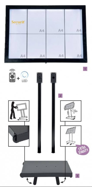 Le monter sur son pied amovible avec socle de 110 cm équipé de roulettes, idéal pour les restaurants souhaitant déplacer régulièrement leur affichage selon l’agencement de la terrasse ou de la salle.