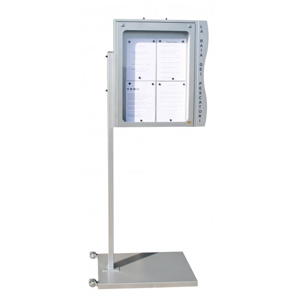 Ce porte menu sur pied 900 x 510 x 1750 mm pour 4 pages a une dimension d'affichage de 730 x 430 mm. Sa structure est conçue en acier zingué et peinte en polyester pour une meilleure résistance contre les corosions.